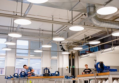 Kvill, som er utstyrt med mikroprismatisk avblending som skaper et jevnt og blendingsfritt lys i verkstedet. Med den symmetriske plasseringen i verkstedet sikres tilstrekkelig lys i hele rommet, og studiemiljøet er betydelig forbedret. Med DALI kan lyset tilpasses etter behov, samtidig som man oppnår et mer effektivt energiforbruk. Med valget av en rund armatur til et verksted skiller Kvill seg ut og skaper virkelig noe utenom det vanlige.