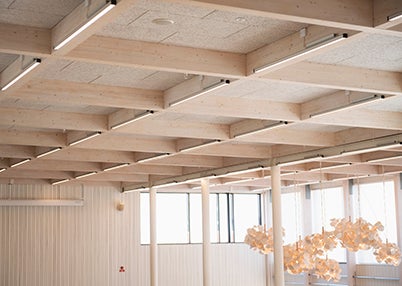 Andre lokaler, som korridorer og studentgarderober, er utstyrt med Lanternin LED-panel og Salix, en downlight som er perfekt for offentlige rom. I trapperommet henger veggmonterte Opuz.