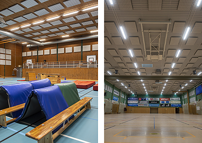 - Vi valgte en enkel DALI-løsning og tilstedeværelsesdeteksjon. Lyset slås av automatisk når det ikke er noen i hallene. Via en trykknapp på veggen kan belysningen stilles inn på 30, 50 eller 100 prosent effekt, og lyset slås alltid på med samme effekt som da det ble slått av. Totalt har vi installert 84 Sarek i de to hallene, utstyrt med beskyttelsesgitter som ekstra tilbehør. I begge hallene er det en gardinvegg som deler flaten på midten. Her har vi mulighet til å styre hver halvdel separat når bare den ene delen brukes. Tidligere var lyset på også i den delen som ikke ble brukt. Dette har også bidratt til å redusere forbruket, sier Reine.