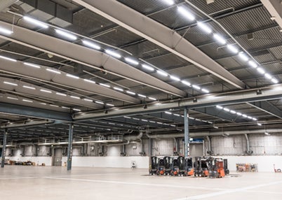 Den da nylanserte industriarmaturen Sarek ble valgt til hall A, den største av de fire utstillingshallene, og samtidig valgte de en DALI-løsning for å få en så effektiv og tilpasningsdyktig belysningsløsning som mulig. Det er enkelt å styre og regulere belysningen når og hvor det er nødvendig, slik at ingen belysning slås på unødvendig. I tillegg har det vært mulig å redusere effekten på Sarek med nesten 20 % og likevel oppnå et tilfredsstillende luxnivå på bakkenivå, til tross for en takhøyde på 15,5 meter. Dette bidrar til ytterligere energibesparelser og forlenget levetid for Sarek. Utstillingshallens verksteder har også fått oppgradert belysning med Z44, en universalarmatur med IP44-klassifisering.