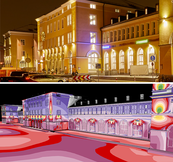 Fasaden på bygningens tre fløyer skulle opprinnelig utstyres med seks veldig smale, oppoverrettede lyskastere for å fremheve bygningsfremspringene med baklys. Dette ville ha vært visuelt ideelt, men var ikke mulig på grunn av ulikt arrangerte gesimser - i midtfløyen uten brudd oppover, men med flere gesimsnivåer til høyre og venstre. I stedet valgte de å bruke flere smalstrålende spotlights over hverandre for å skape lik effekt på alle tre fløyer av bygget til tross for ulike forhold. Lyskasterne rettes slik at lysfordelingen smalner oppover mot fasadeveggen og ender ved hovedgesims for å hindre at himmelen blir opplyst.