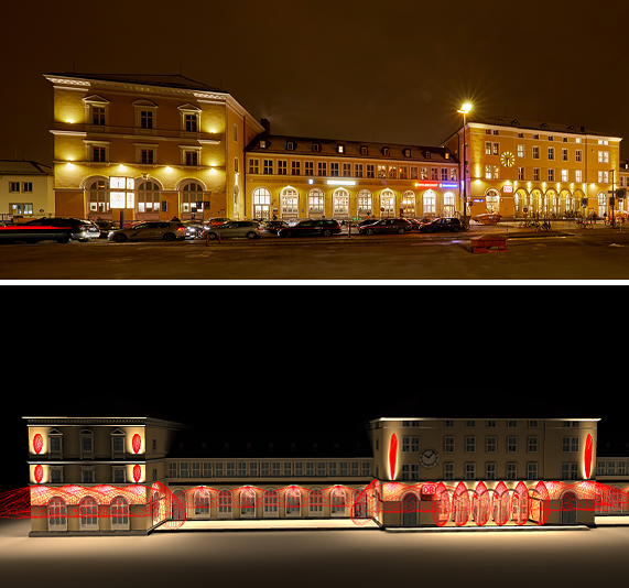 Den 120 meter brede mottaksbygningen ved Regensburg sentralstasjon ligger i den sørlige kanten av den historiske gamlebyen og var frem til 2023 uten nevneverdig utvendig belysning - med unntak av mastelysene på stasjonsplassen, som tilhører byen av Regensburg. Funksjonell belysning av byggets umiddelbare omgivelser var derfor svært viktig for kundene. Hensikten med belysningen var å øke den generelle sikkerheten rundt stasjonsbygningen og å bedre den visuelle situasjonen ved innganger og trapper, også for personer med nedsatt funksjonsevne. I samråd med Monumentvernkontoret ble gesimsen på bygningsfasaden godkjent for armaturmontering, dog uten veggarm eller brakett. Belysningen, som opprinnelig var planlagt å være rent funksjonell, var i utgangspunktet kun beregnet for direkte belysning på det nederste nivået av fasaden. I samråd med oppdragsgiverne ble imidlertid lysdesignet utvidet for å fremheve de arkitektoniske detaljene. Bygningens tre karakteristiske utstikkende fløyer kan nå sees langveisfra. Utvidelsen av fasadebelysningen formidler nå økt sikkerhet og en innbydende atmosfære for besøkende og omkringliggende restauranter og hoteller.
