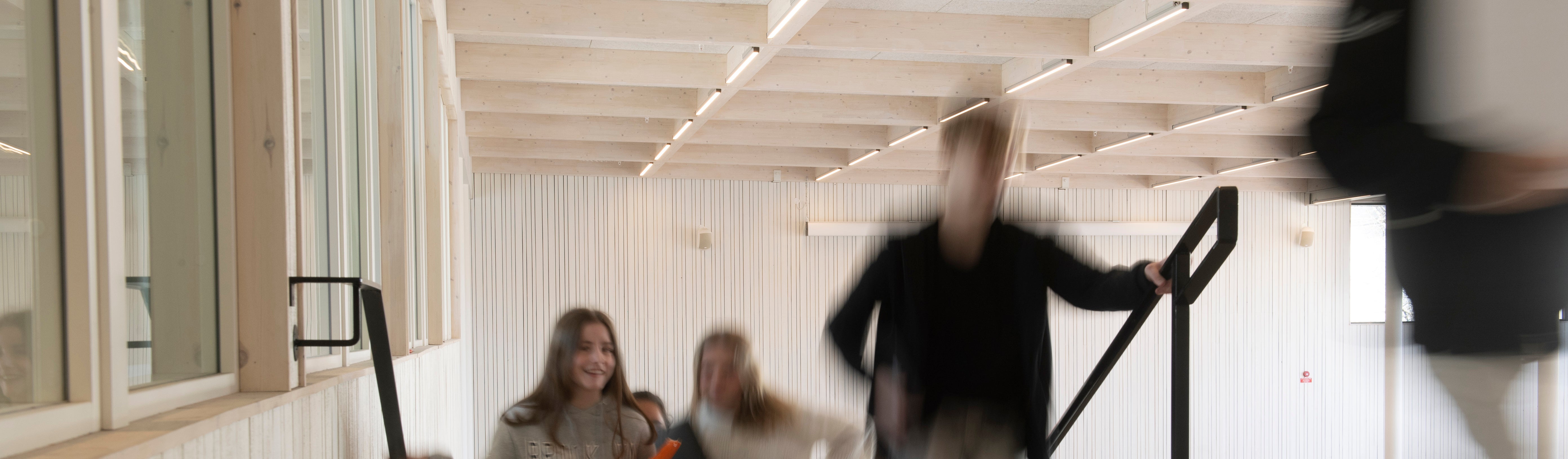 Når du kommer inn på skolen, havner du i det som er skolens midtpunkt, det store åpne rommet som kalles Auditoriet. Her samles elever og ansatte når de ikke har undervisning, og ved større fellesarrangementer. I rommet ligger en stor trapp og den populære kafeteriaen. Auditoriet har et fint naturlig lysinnfall gjennom de store vinduene, og den diskrete armaturen Grace Line er montert i taket for å supplere belysningen i den mørke delen av året. Joakim Lund, som er lysdesigner hos Aura Light, hadde et tett samarbeid med kunden der de sammen kom frem til den gode belysningsløsningen.