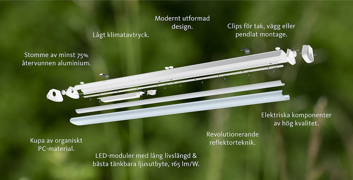 Kleva är en miljövänlig och energieffektiv belysningsarmatur med hög prestanda och bra ljuskvalitet. Den är IP44-klassad och anpassad för tuffa industriella miljöer men tack vare sin design passar den även allmänutrymmen som korridorer. Kleva är lätt att installera och har tillbehör för olika monteringsalternativ. Den är tillverkad av 75% återvunnen aluminium och har en klimatneutral PC-plastkupa.